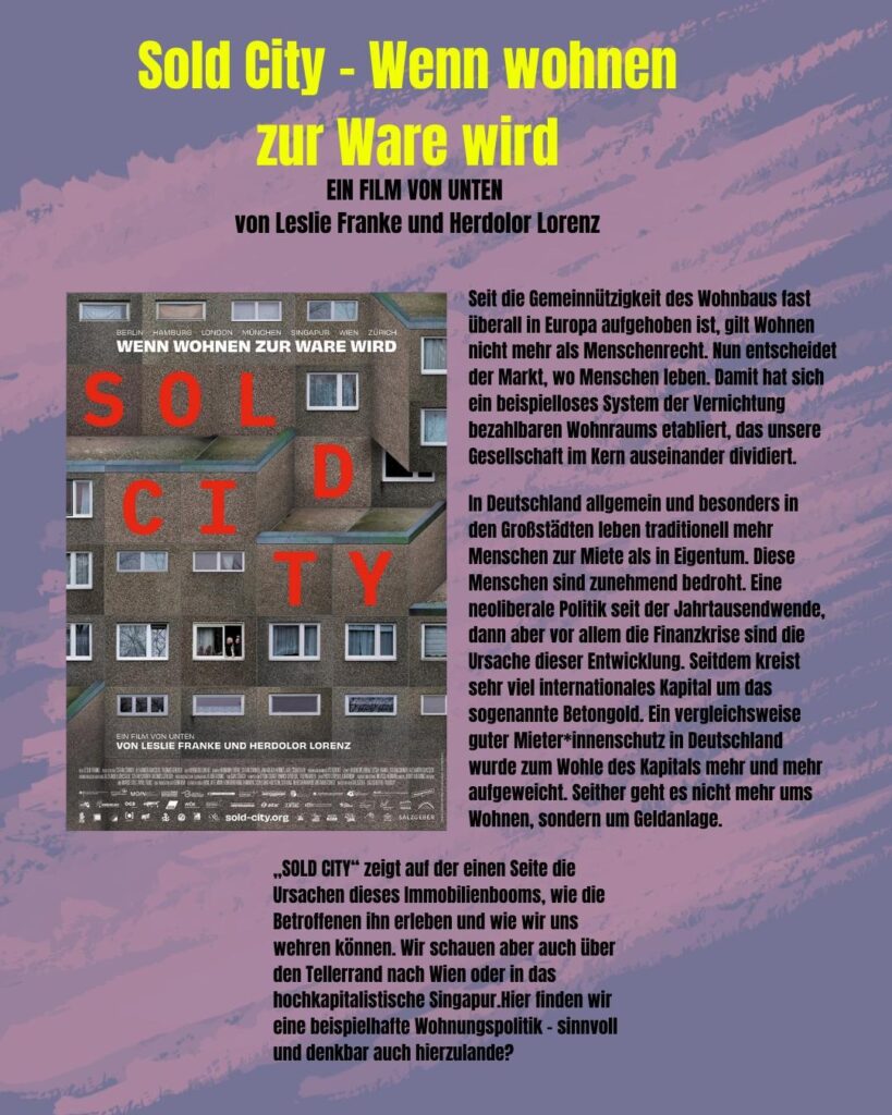 Am Montag zeigen wir den Film “SOLD CITY – Wenn Wohnen zur Ware wird” und am Dienstag gibt es leckere Linsensuppe mit Ofengemüse und Brot. An beiden Tagen wird es Hausführungen geben, bei denen ihr mehr über uns und unser Hausprojekt erfahren könnt.
