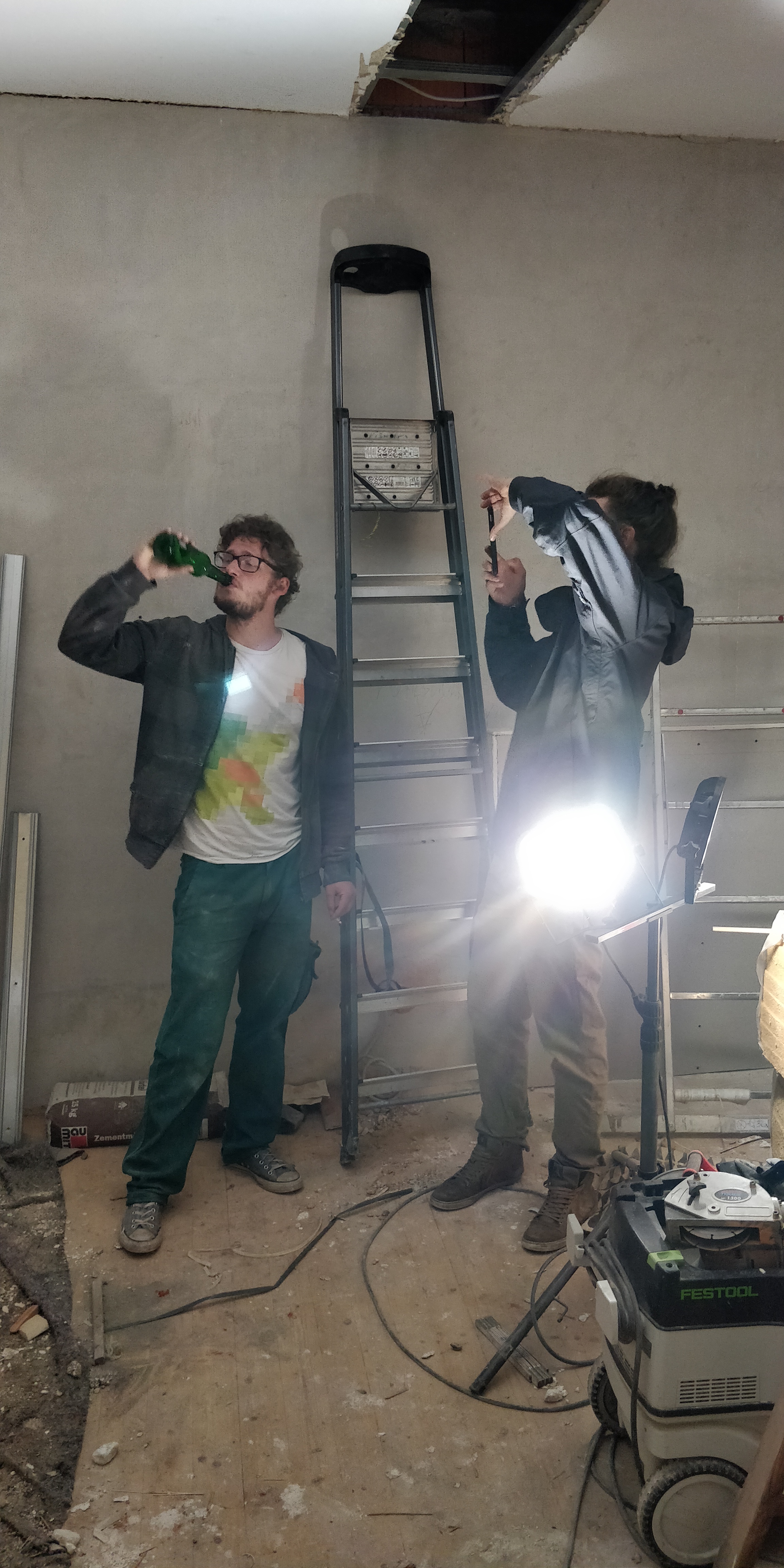 Wir haben unser Haus bereits zu großen Teilen und weitestgehend in Eigenleistung renoviert. Wir versuchen so viel wie möglich selbst zu machen und werden dabei von Freund*innen, Bekannten und solidarischen Handwerker*innen unterstützt. Manches lernen wir erst nachdem wir angefangen haben. Es wird nicht alles perfekt aber das meiste solide und mit viel Spaß bei der Arbeit.